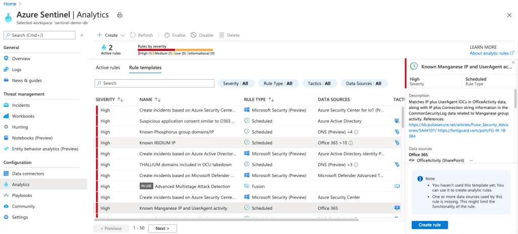 So far, you have your logs and some data visualization. Now it would be great to have some proactive analytics across your data, so you’re notified when something suspicious occurs. You can enable built-in analytics alerts within your Sentinel workspace. There are various types of alerts, some of which you can edit to your own needs. Other alerts are built on machine-learning models that are proprietary to Microsoft. You can also create custom, scheduled alerts from scratch.