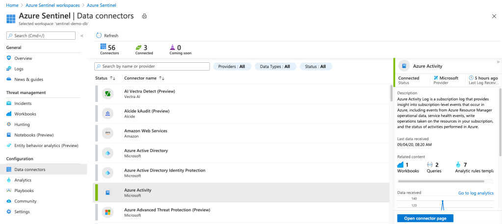 The first thing to do is to have your data ingested into Azure Sentinel. Data connectors enable you to do just that. You can add some services, such as Azure activity logs, just by selecting a button. Others, such as syslog, require a little configuration. There are data connectors that cover all scenarios and sources, including but not limited to: